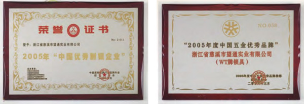 2005年,荣获中国国际锁具行业品牌年会颁发“中国优秀制锁企业”证书;同年被评为“中国优秀五金品牌”。